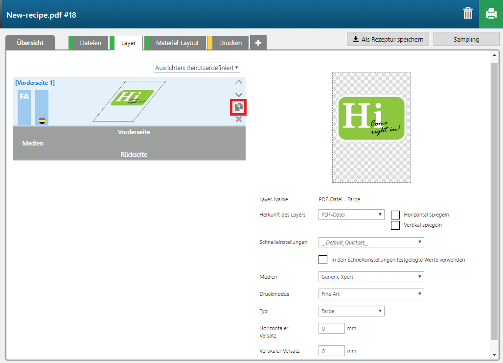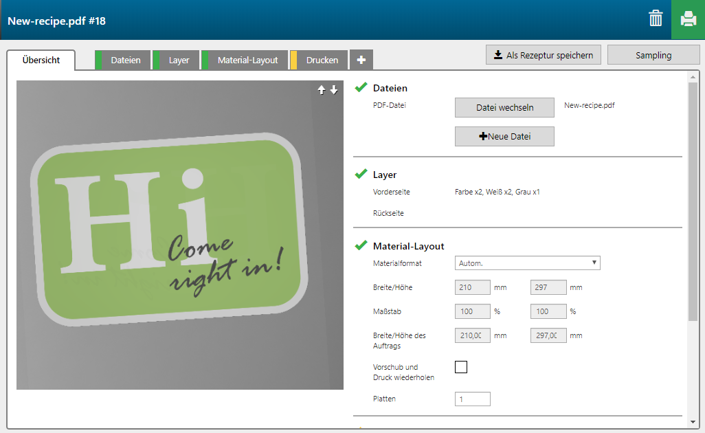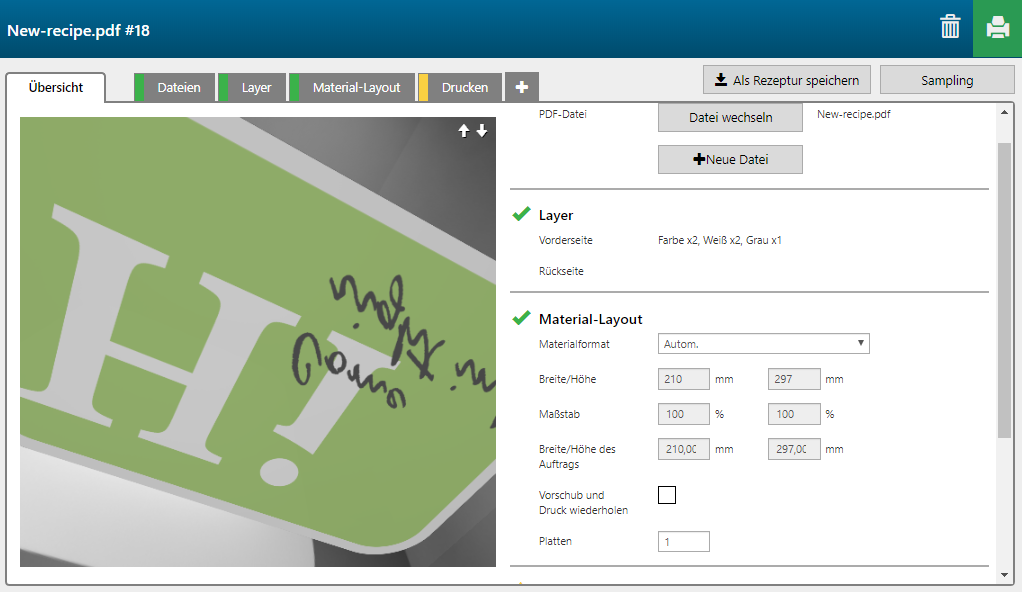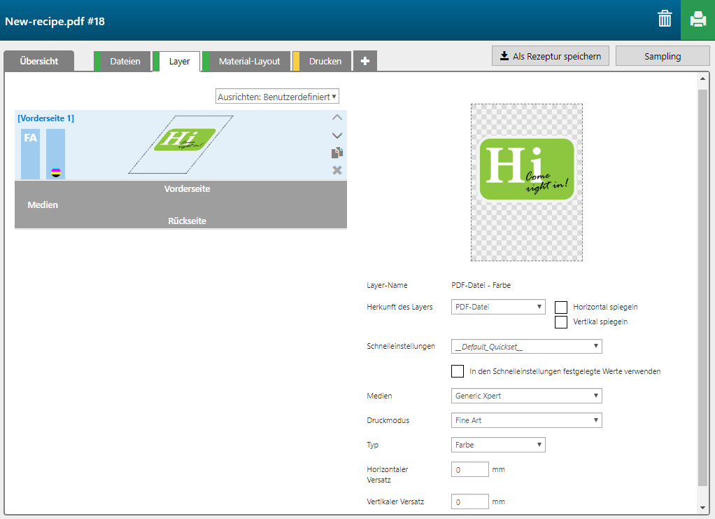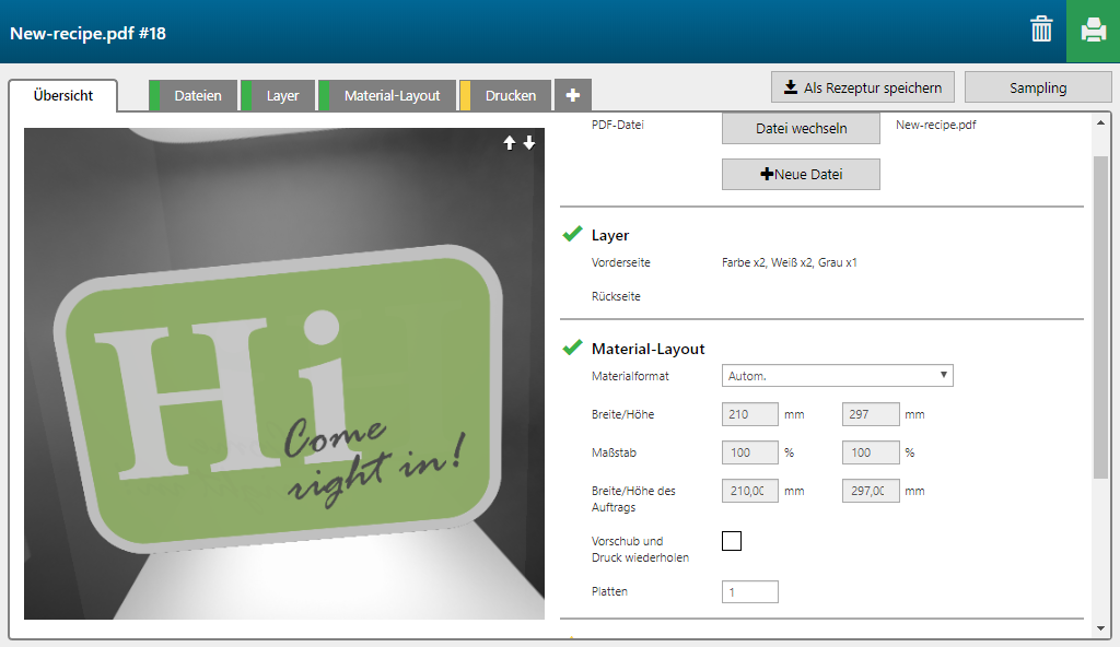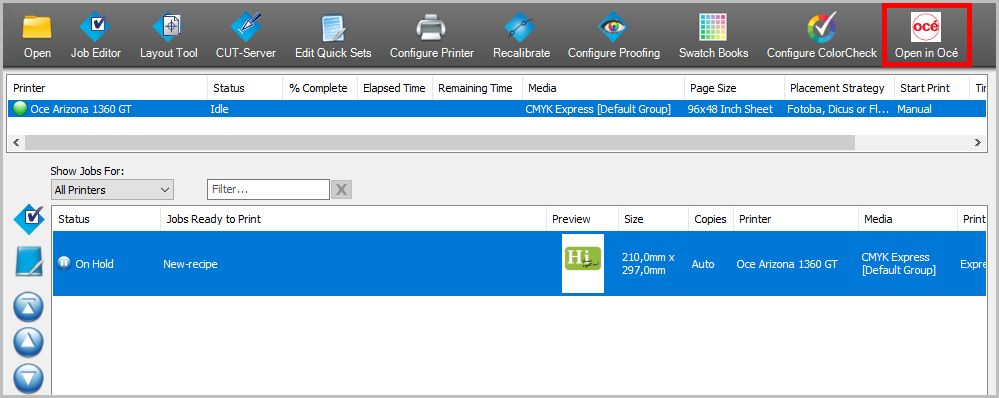Es wird ein neuer Océ Arizona Xpert Engine-Auftrag mit einem einzelnen Layer erstellt.