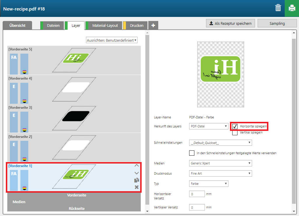 Klicken Sie auf die Registerkarte [Layer]. Wählen Sie den unteren Layer aus, und klicken Sie auf [Horizontal spiegeln].