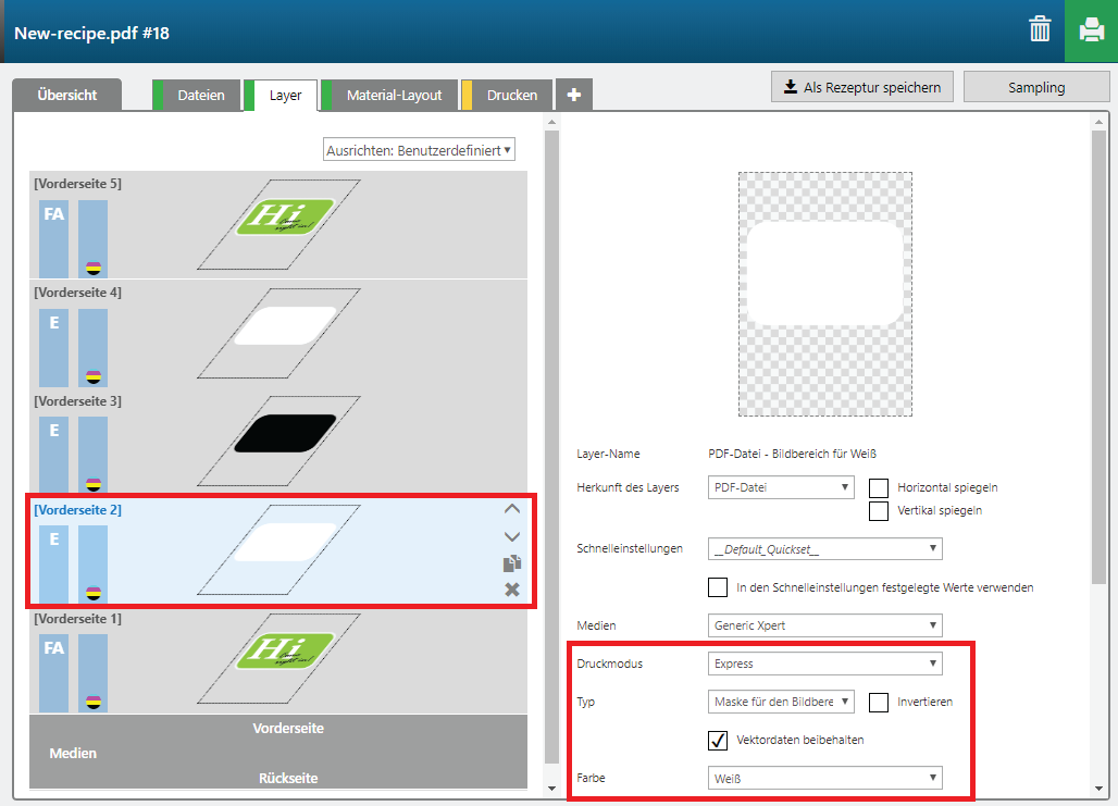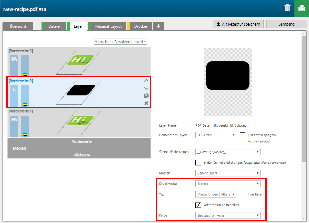Um den Blockout-Layer zwischen den beiden Farb-Layern zu erstellen, ändern Sie den Layer-Typ des mittleren Layers auf [Maske für den Bildbereich]. Ändern Sie die Farbe des Layers auf [Blockout (schwarz)]. Für diesen Layer können Sie auch einen anderen Druckmodus wählen, z. B. ihn in [Express] ändern.