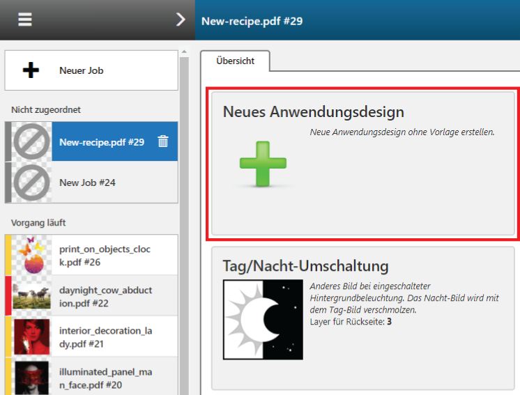 Wählen Sie die PDF-Datei in der Auftragsliste aus, und klicken Sie auf [New application].