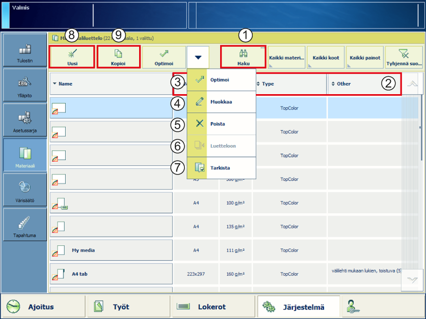 [Uusi] (8): uuden materiaalin lisääminen tulostusmateriaaliluetteloon.