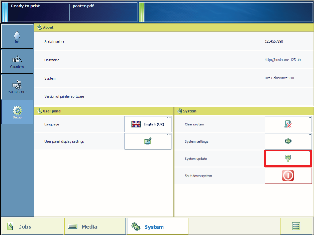 You can check the current software version under System menu - [System update] on the user panel or under the [Support] - [Update] tab in Océ Express WebTools.