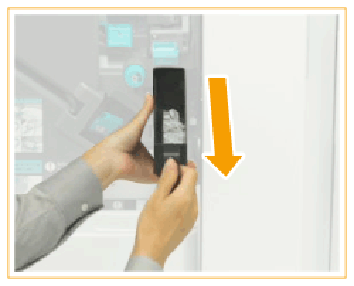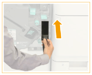 O sistema de impressão não consegue fazer perfurações se do tabuleiro de desperdícios de perfurações estiver cheia. Esta instrução apenas descreve a remoção de resíduos de perfuração da/do empilhadora/agrafador. Consulte o manual do utilizador do furador profissional para saber como remover resíduos de perfuração do furador profissional.