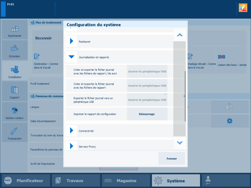 1. Sur le panneau de commande, touchez : [Système]  → [Installation]  → [Configuration du système]  → [Journalisation et rapports].