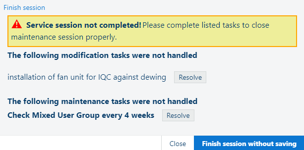 Use this option to exit ADAM and save the service visit data. All mandatory fields need to be filled in. If you did not cover all the mandatory items (problems, issues, maintenance), then they will be prompted in this window. |