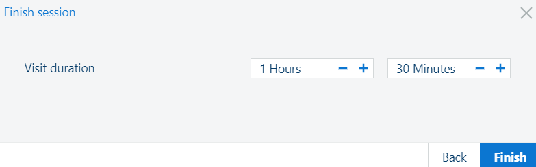 Before the [Exit with save] is possible, a Visit duration must be entered. Use the - and + buttons for the Hours and Minutes to indicate the duration of the visit. |