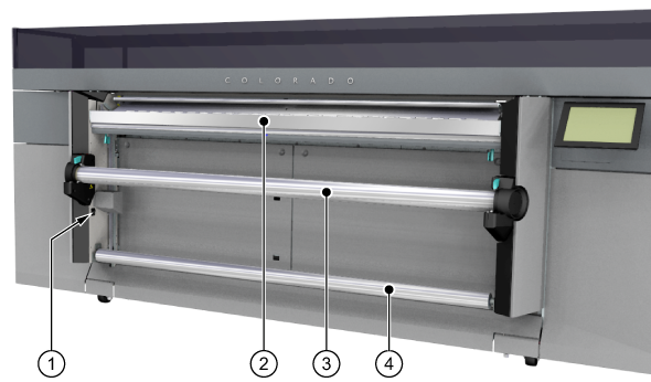 Odvíječ rolí se nachází na výstupní straně média a může být používán k navíjení vytištěného média.