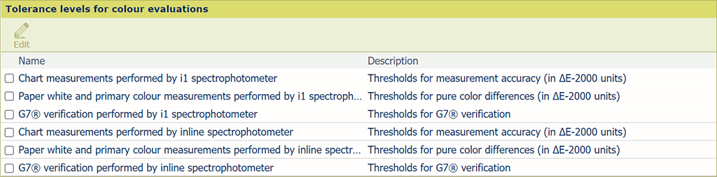 A avaliação dos resultados da calibragem da família de materiais e de verificação de G7 baseiam-se nos níveis de tolerância definidos.