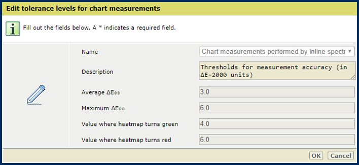 Os métodos de avaliação de cores utilizam métricas para decidir se as cores impressas estão suficientemente próximas das respetivas cores de referência. Um nível de tolerância ou nível de limiar é definido antes de a avaliação ocorrer. O nível especifica o ponto onde uma diferença calculada é ainda aceitável. Um nível de tolerância também é expresso por um valor △(Delta).