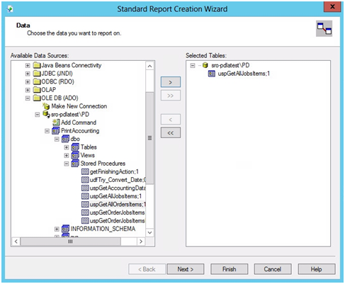 Jelentés létrehozásakor választhat táblázatokat vagy egy tárolt folyamatot. Egy-egy táblázat korlátozott jegytételek készletét tartalmazza. Egy tárolt folyamat az SQL-utasítások csoportjából áll, amelyek egyetlen végrehajtási tervvé vannak egyesítve. A következő tárolt eljárásokat lehet kiválasztani jelentésenként: