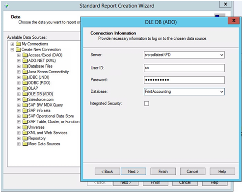 A PrintAccounting adatbázis ezután rendelkezésre áll a Crystal Reports-hoz.