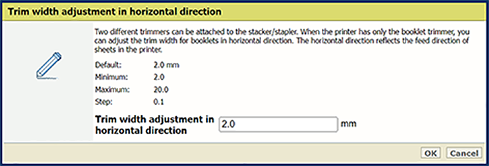 Paramètre [Hauteur de pile maximale] Deux unité de découpage différentes peuvent être associées à l’empileur/agrafeuse. Lorsque l’imprimante est dotée uniquement de l’unité de découpage de brochure, vous pouvez régler la largeur de découpe pour les brochures dans le sens horizontal avec le paramètre [Réglage de la largeur de découpe dans le sens horizontal].