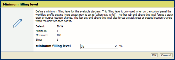 Paramètre [Bac d'empilage - Empilage décalé] Utilisez le paramètre [Niveau de remplissage minimum] pour définir le niveau de remplissage minimum pour les empileurs disponibles.