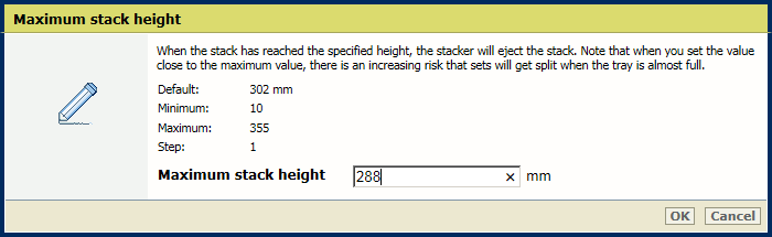 Paramètre [Niveau de remplissage minimum] Utilisez le paramètre [Hauteur de pile maximale] pour définir la hauteur de pile maximale dans les bacs empileurs.