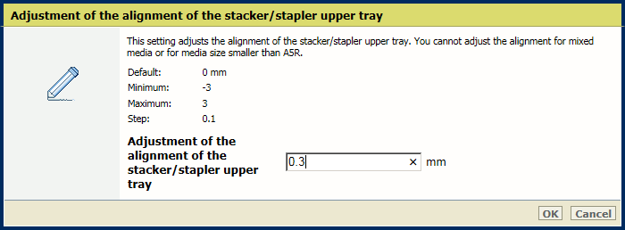 Paramètre [Réglage de l'alignement du bac supérieur de l'empileur/agrafeuse] Utilisez le paramètre [Réglage de l'alignement du bac inférieur de l'empileur/agrafeuse] pour régler l’alignement du bac inférieur.