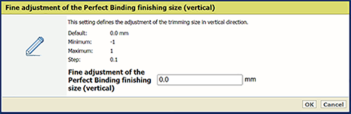 Paramètre [Réglage de la largeur de découpe dans le sens horizontal] Utilisez les paramètres [Réglage fin de la taille de finition Reliure sans couture (horizontale)] et [Réglage fin de la taille de finition Reliure sans couture (horizontale)] pour définir le réglage de la taille de finition Reliure sans couture dans les sens horizontal et vertical.