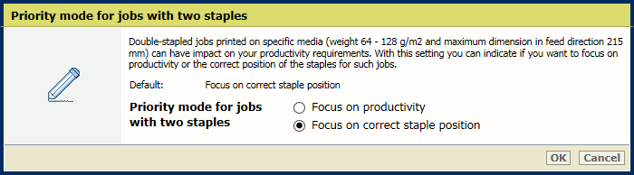 Paramètre [Mode Priorité pour travaux piqués à cheval avec quelques pages] Utilisez le paramètre [Mode Priorité pour les travaux avec deux agrafes] pour indiquer si la priorité doit être donnée à la productivité ou à l’alignement des feuilles dans la sortie lors de l’impression de travaux avec deux agrafes.