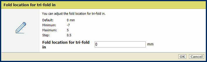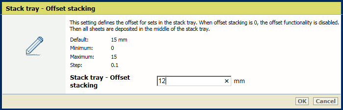 [Fold location for tri-fold in] settingUse the [Stack tray - Offset stacking] setting to define the offset for the sets in the stack tray. When the value is set to 0, the offset functionality is disabled.