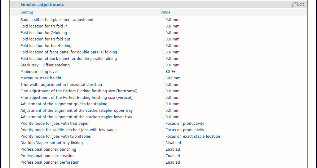 [Adjustment of the alignment of the stacker/stapler lower tray] settingUse the [Priority mode for jobs with thin paper] setting to indicate whether priority must be given to productivity or sheet alignment in the output while printing jobs on thin paper.
