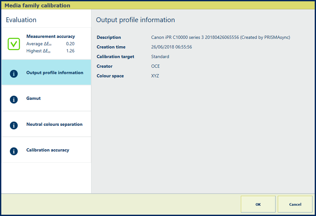 Popis Údaje v sekci [Informace výstupního profilu] obsahují následující charakteristiky o výstupním profilu: popis výstupního profilu, čas vytvoření, cíl kalibrace, tvůrce a barevný prostor. |