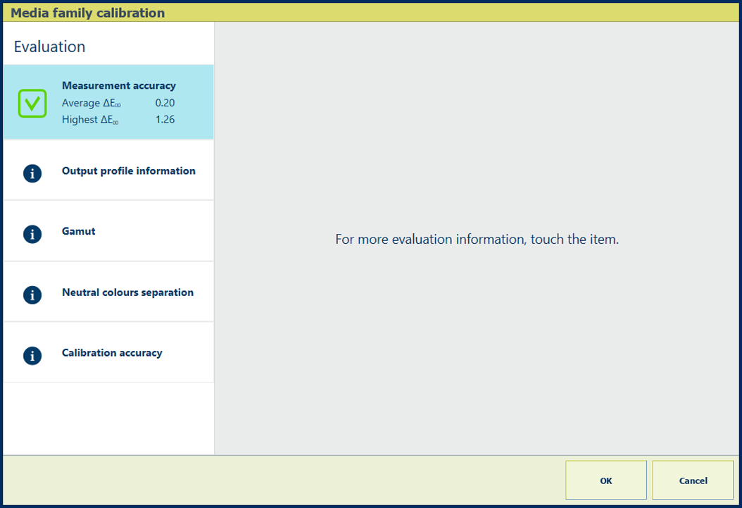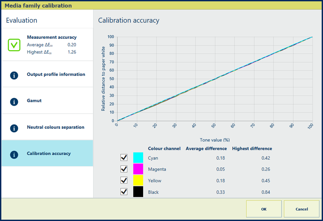 Okno se zpětnou vazbou na postup vytvoření profiluPokud je zobrazena zelená ikona zaškrtnutí, stisknutím tlačítka [OK] uložte nové kalibrační křivky.