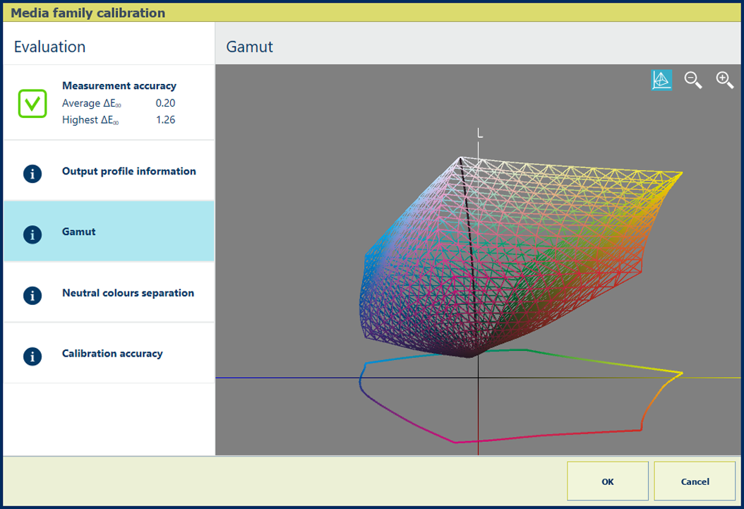 Popis Údaje v sekci [Gamut] ukazují kvalitu výstupního profilu. Jedná se o vizuální reprezentaci rozsahu barev, který může tiskárna reprodukovat s vytvořeným výstupním profilem na použitém médiu. Stisknutím ikony drátěného modelu