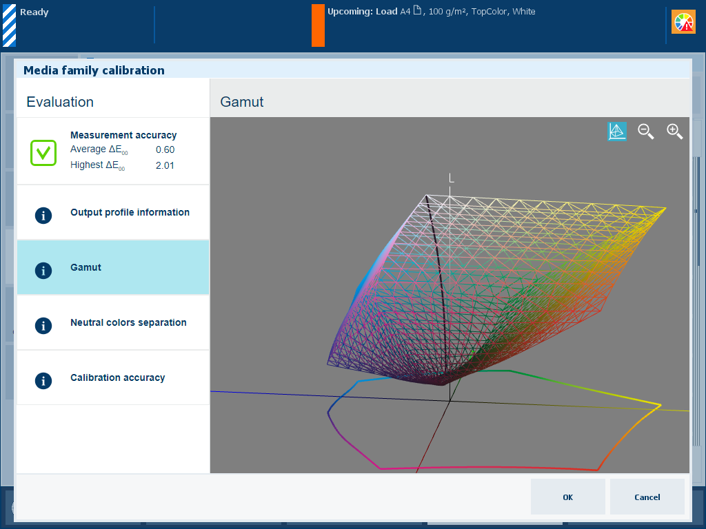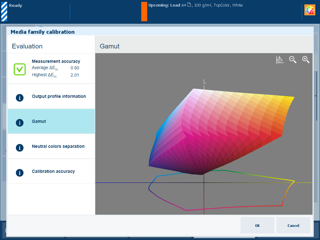 Description The [Gamut] information is an indication of the quality of the output profile. It is a visual representation of the color gamut that the printer can produce with the created output profile on the used media. Touch the wire frame
