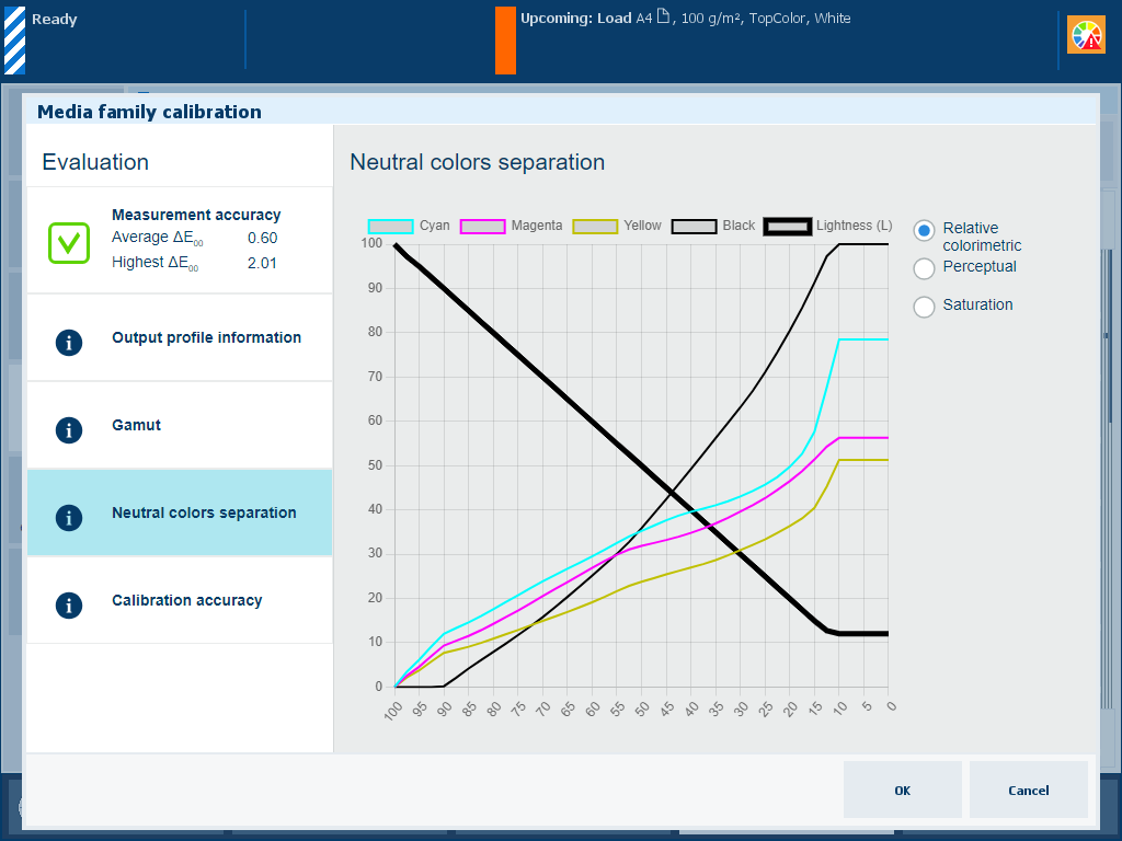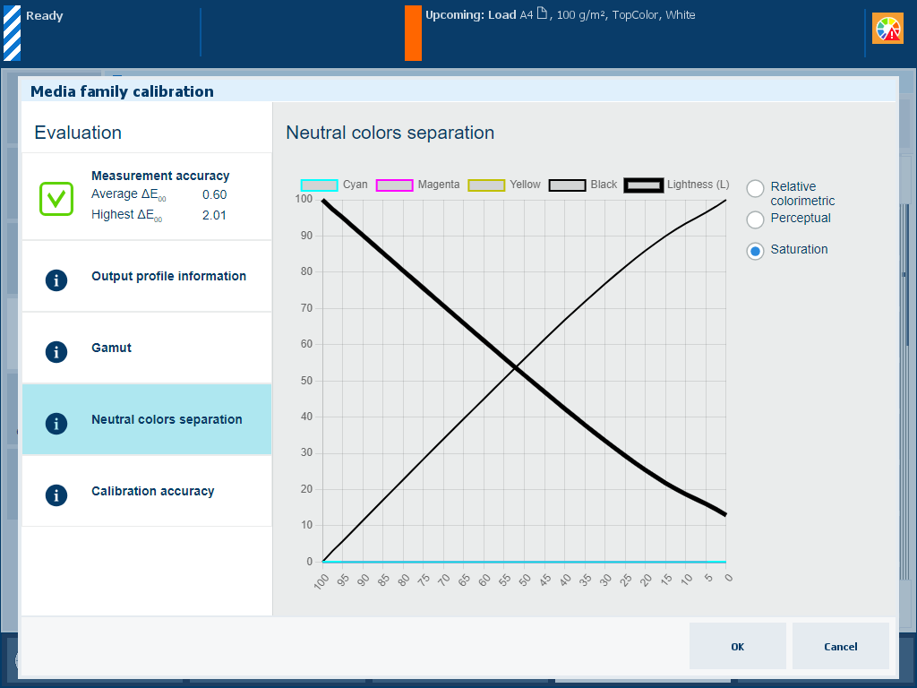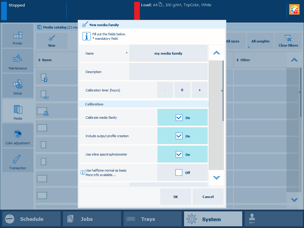 The creation of new output profiles can be done during the media family calibration. The embedded color profiler creates and installs an output profile and calibration curve for every halftone. As part of the procedure, you measure the calibration charts printed on the specific media.