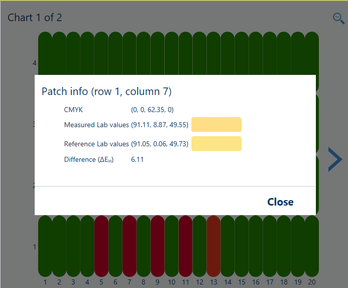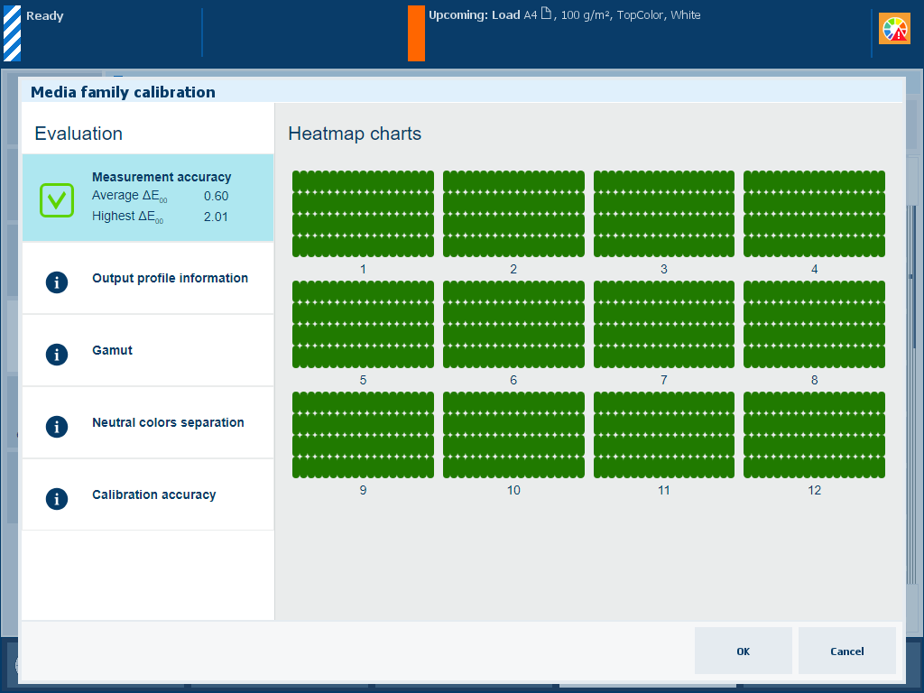 Description The ΔE values of the [Measurement accuracy] information are indicators for the accuracy by which the patches are printed and measured. The control panel displays a heatmap whose patch locations correspond with the printed chart. |