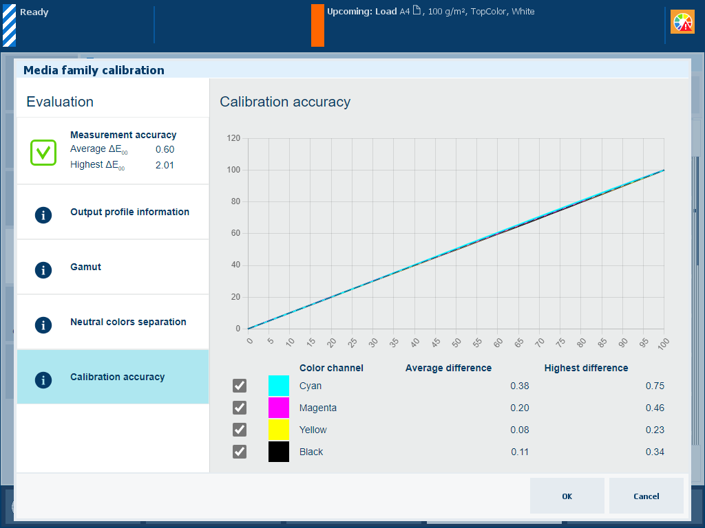 Description The percentage values of the [Calibration accuracy] information show how well the calibration procedure and output profile fit together. The graph shows per color channel how close the measured values meet the target values. |