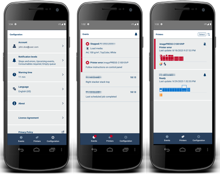 Programmet PRISMAremote Monitoring lagras på Microsoft Azure-plattformen och använder en PRISMA Home cloud service som ger snabb, tillförlitlig och säker leverans av molndata. Appen PRISMAremote Monitoring visar aktuell status, kommande händelser som påfyllning av material eller förbrukningsartiklar samt problem som kräver omedelbar åtgärd för varje molntjänstskrivare.