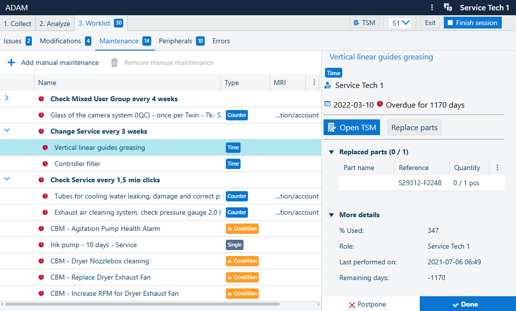 In the [Maintenance] screen you see actions and product specific notifications that are relevant during this service visit.