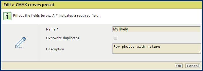 [CMYK-görbe-előbeállítás szerkesztése] Egy meglévő CMYK-görbe-előbeállítás felülírásához használja a [Duplikált elemek felülírása] beállítást.