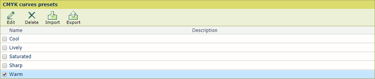 CMNY-görbe-előbeállításokat szerkeszthet, törölhet, importálhat és exportálhat.
