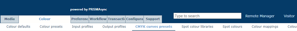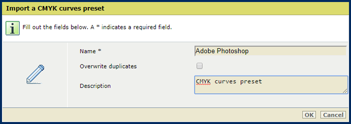 A CMYK-görbe-előbeállítás az importálást követően használható a hordozócsaládoknál és a nyomtatási munkáknál.