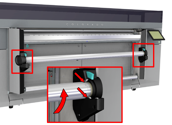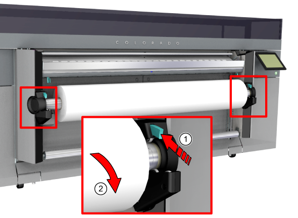 2. 巻き取りロール紙シャフト両側の緑のレバーを押します。ワインダーから巻き取りロール紙を取り外します。