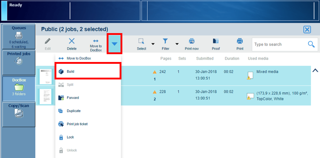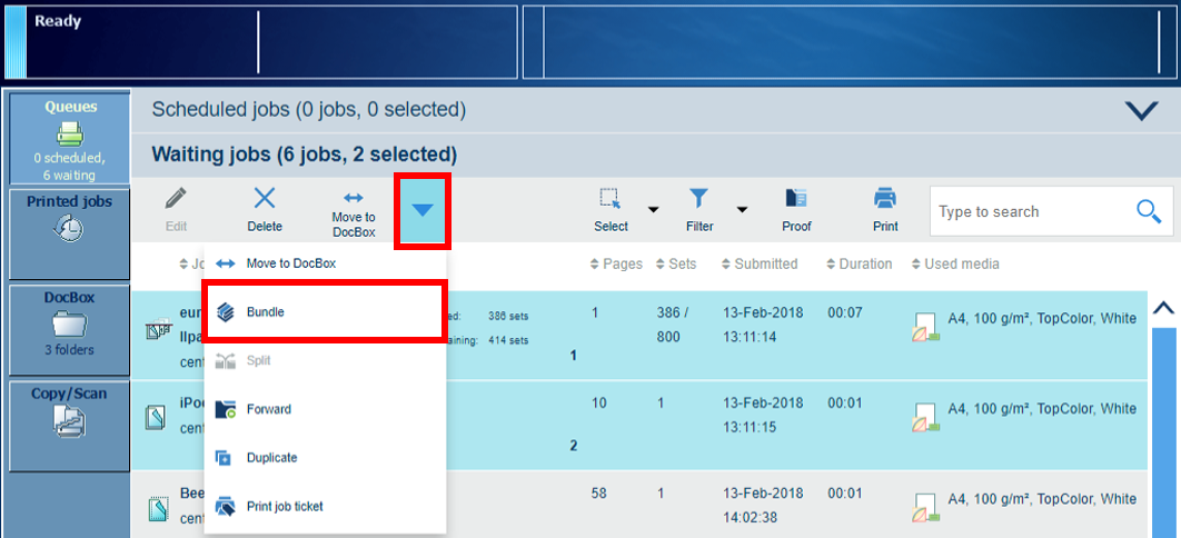 Aby zwiększyć wydajność drukowania, możesz połączyć kilka zadań oczekujących lub zadań DocBox w jedno zadanie. Możesz zmienić niektóre właściwości połączonych zadań oraz kolejność zadań.
