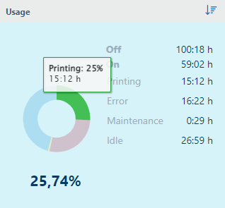 In de kolom [Verbruik] wordt het gebruik van de printer tijdens de geselecteerde periode weergegeven. U kunt zien hoe lang de printer aan, uit, inactief, aan het afdrukken, in storing en in onderhoud was. Met het percentage onder het cirkeldiagram wordt aangegeven hoeveel tijd de printer bezig was met afdrukken, gemeten ten opzichte van de tijd dat de printer was ingeschakeld.