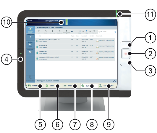 Pulsante [Lavori] per accedere alle posizioni dei lavori: l'elenco dei lavori pianificati, l'elenco dei lavori in attesa, l'elenco dei lavori stampati, l'elenco dei lavori di scansione e le cartelle DocBox |