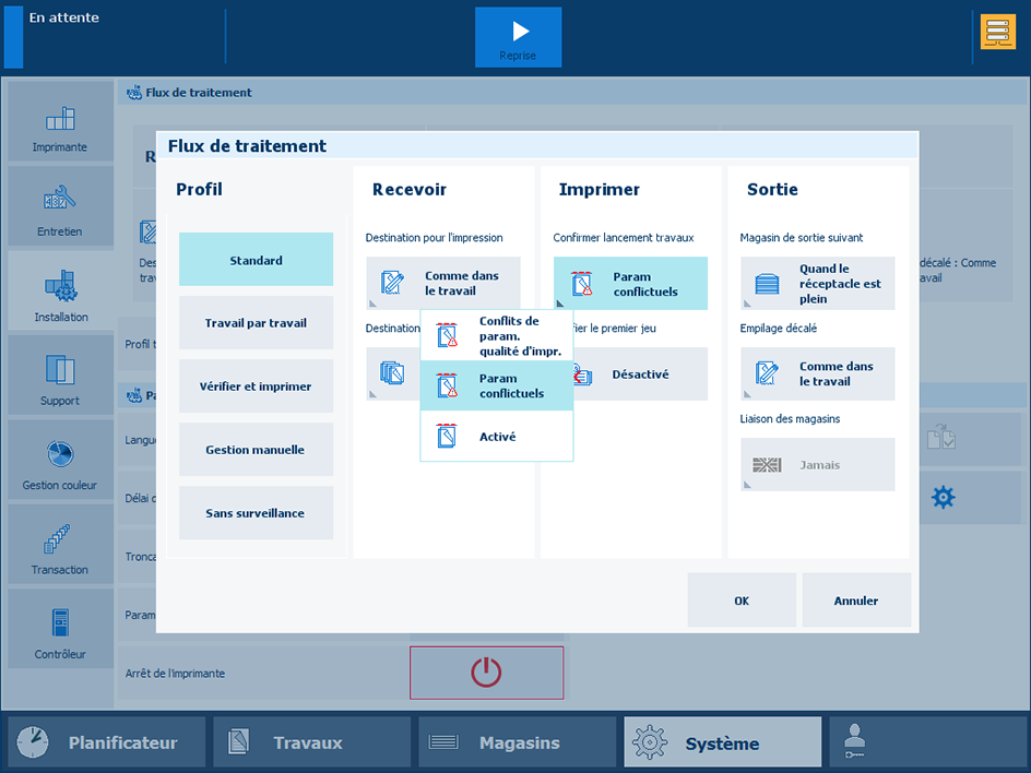 • [Confirm. début travail : Si paramètres qualité impression conflict]: Confirmez qu’un travail peut commencer avec les paramètres par défaut en cas de paramètres de qualité d’impression conflictuels. Le mode d’impression du support requis est inconnu. Le travail sera imprimé avec le mode d’impression du support par défaut au lieu du mode d’impression du support demandé.
