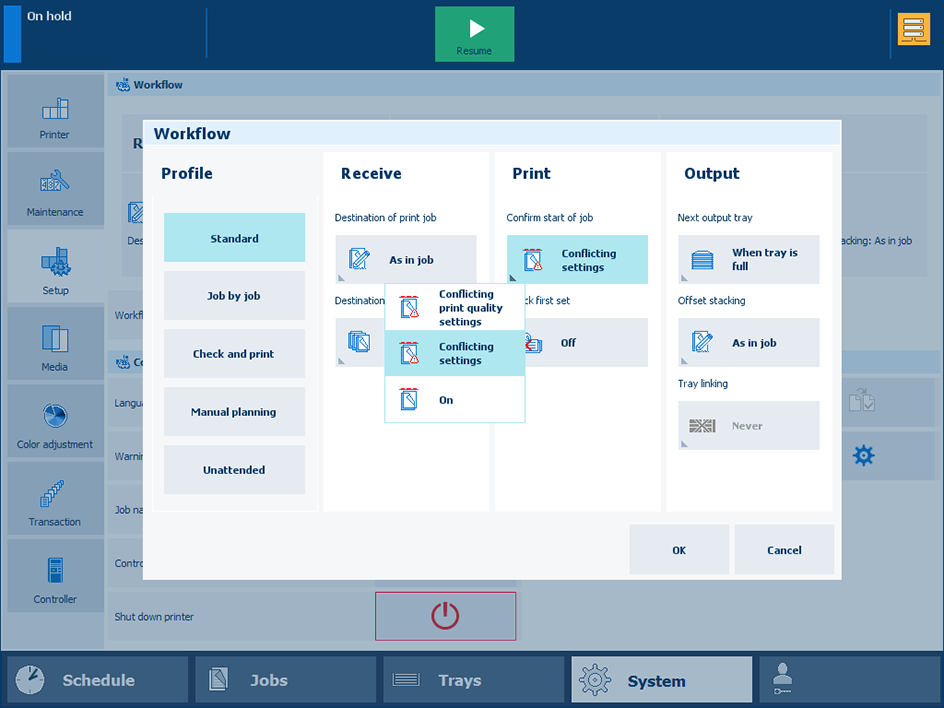 You select one of the available standard workflow profiles and, if required, change one or more attributes so it fits the print production requirements. Only one custom workflow profile can be active at the same time.