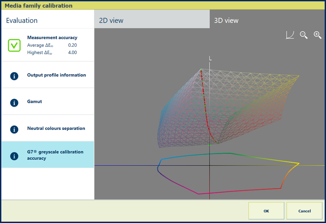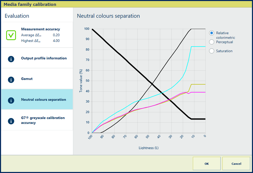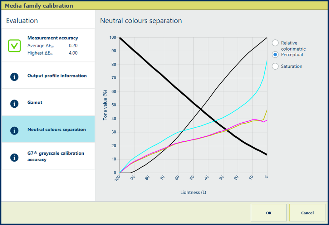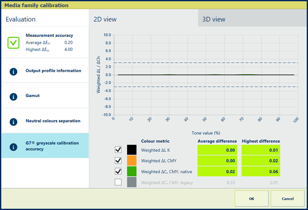 Description Les valeurs en pourcentage de l'information montrent à quel point la procédure d'étalonnage et le profil de sortie sont compatibles. Le graphique montre par canal de couleur à quel point les valeurs mesurées sont proches des valeurs cibles G7®. |