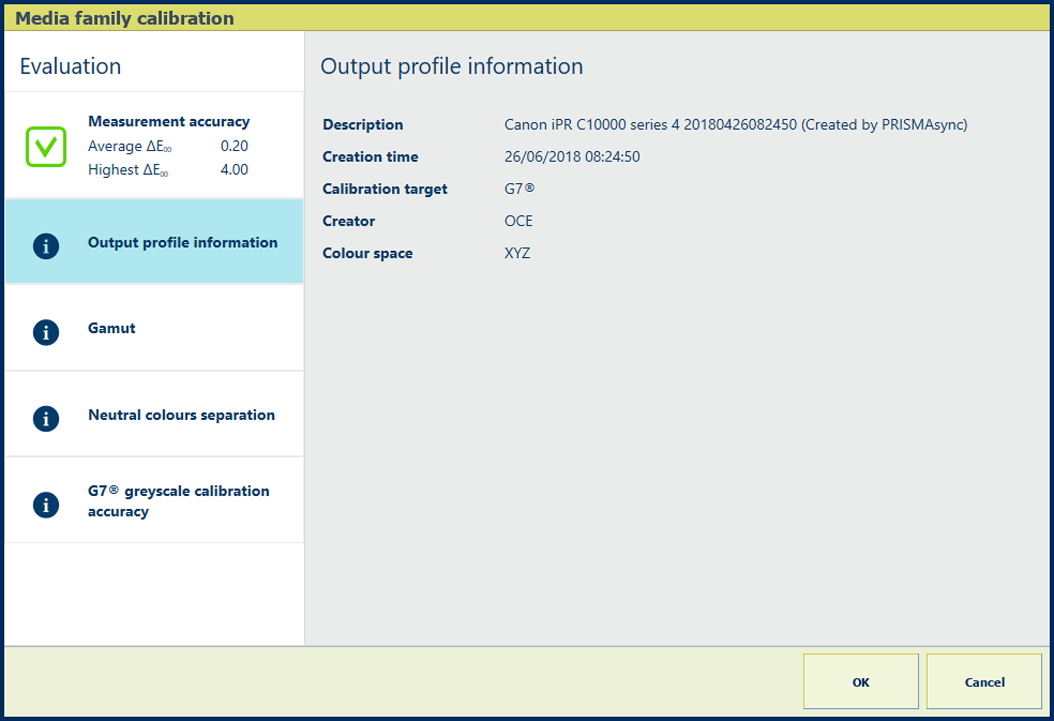 L'étalonnage d’un G7®étalonnage de la famille de supports inclut la création très facile et rapide de G7®profils de sortie grâce au profileur intégré PRISMAsync. PRISMAsync utilise des familles de supports pour indiquer les profils de sortie et les courbes d'étalonnage qui doivent être appliqués à un support. Par conséquent, la création d’une nouvelle famille de supports avec de nouveaux profils de sortie et de nouvelles courbes de calibrage fait partie de cette procédure. PRISMAsync dispose de familles de supports standard et de familles de supports G7®.