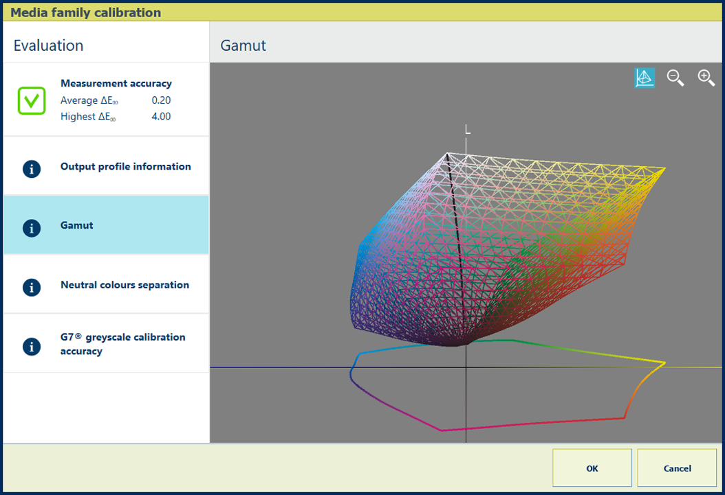 Description Les informations [Gamme de couleurs] sont une indication de la qualité du profil de sortie. Il s'agit d'une représentation visuelle de la gamme des couleurs reproductibles que l'imprimante peut produire avec le profil de sortie créé sur le support utilisé. Touchez l'icône de l'armature métallique |
