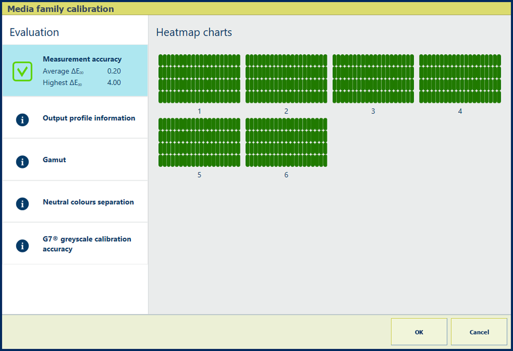 Fenêtre de commentaires de l'étalonnage de la famille de supports G7®Lorsque vous voyez une icône de coche verte, touchez [OK] pour enregistrer les nouvelles courbes d'étalonnage.