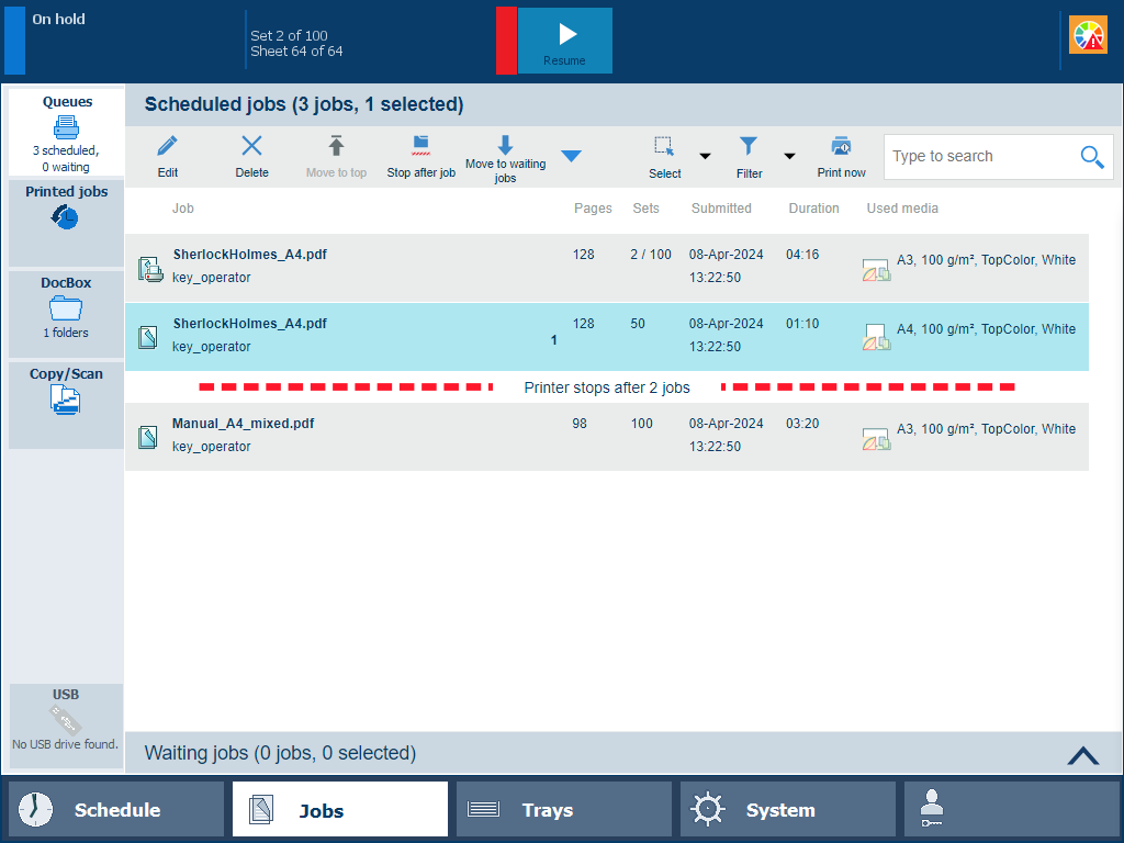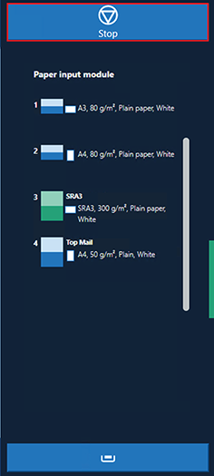 There are different ways to stop or delay the print production with the stop button or the stop after job function.