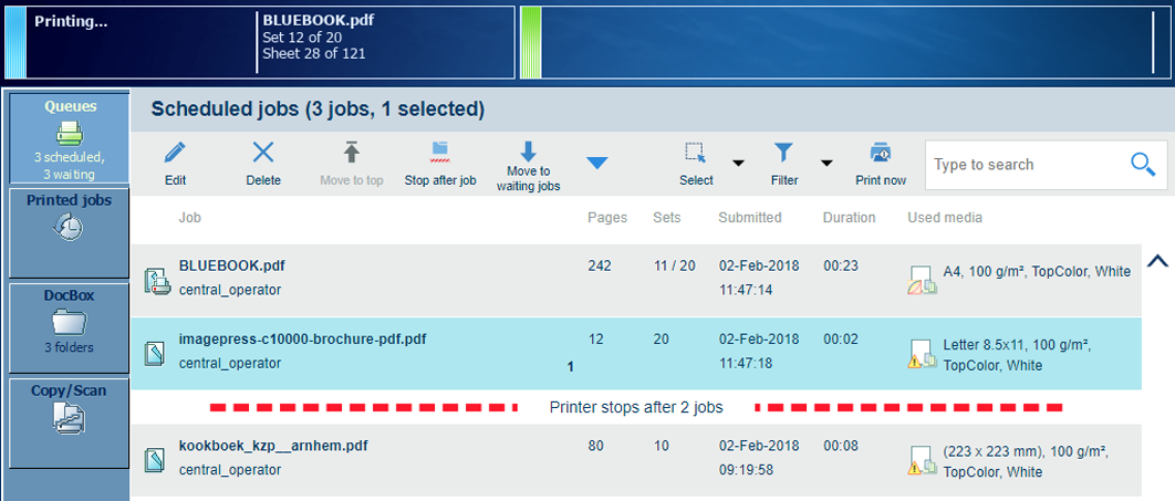 Existem diferentes formas de parar ou atrasar a produção de impressões com o botão para parar ou com a função parar após trabalho.