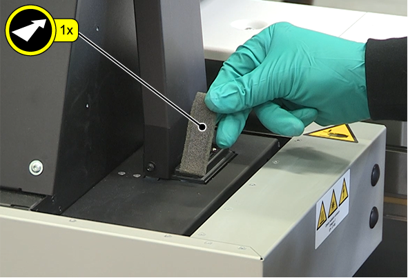 Det anbefales å bruke hansker ved håndtering av tilsmussede UV LED-enhetsfiltre på grunn av muligheten for delvis herdede blekkavleiringer.