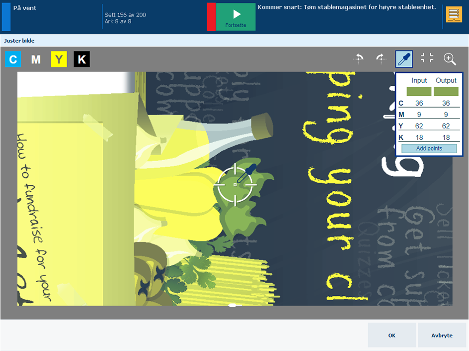 CMYK-fargenes innmatingstetthet (%) og utskriftstetthet (%) vises.