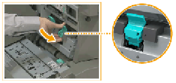 Nehmen Sie die Druckausgabe aus dem Broschürenfach, bevor Sie die Heftklammerkassette in der Einheit für Sattelheftung ersetzen.